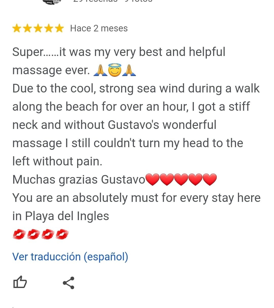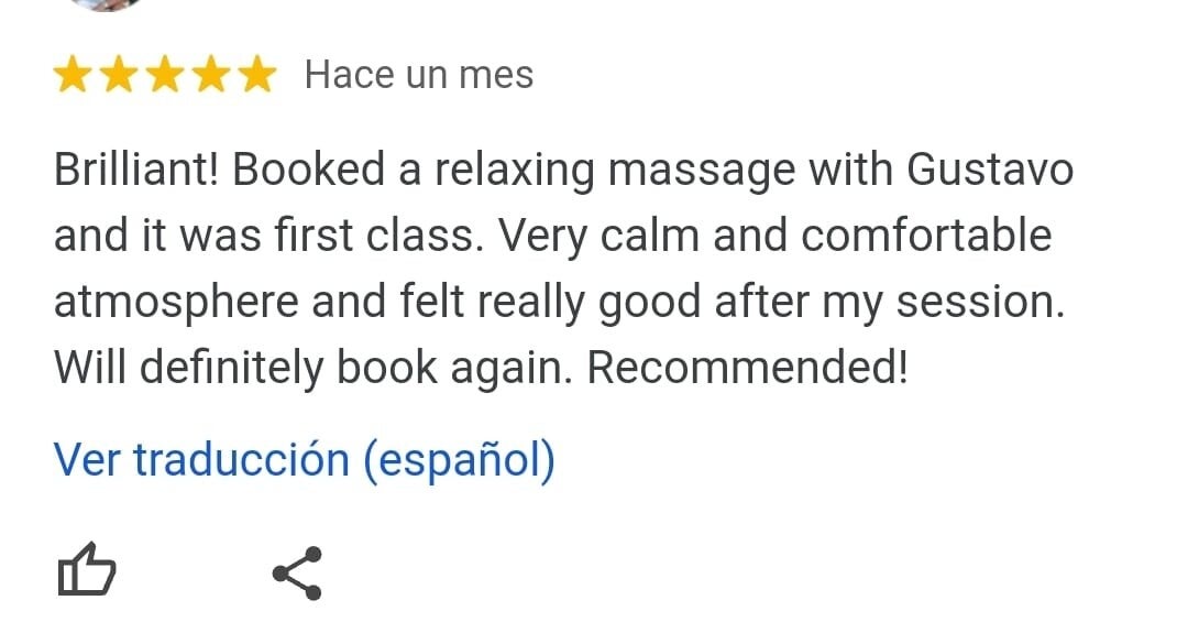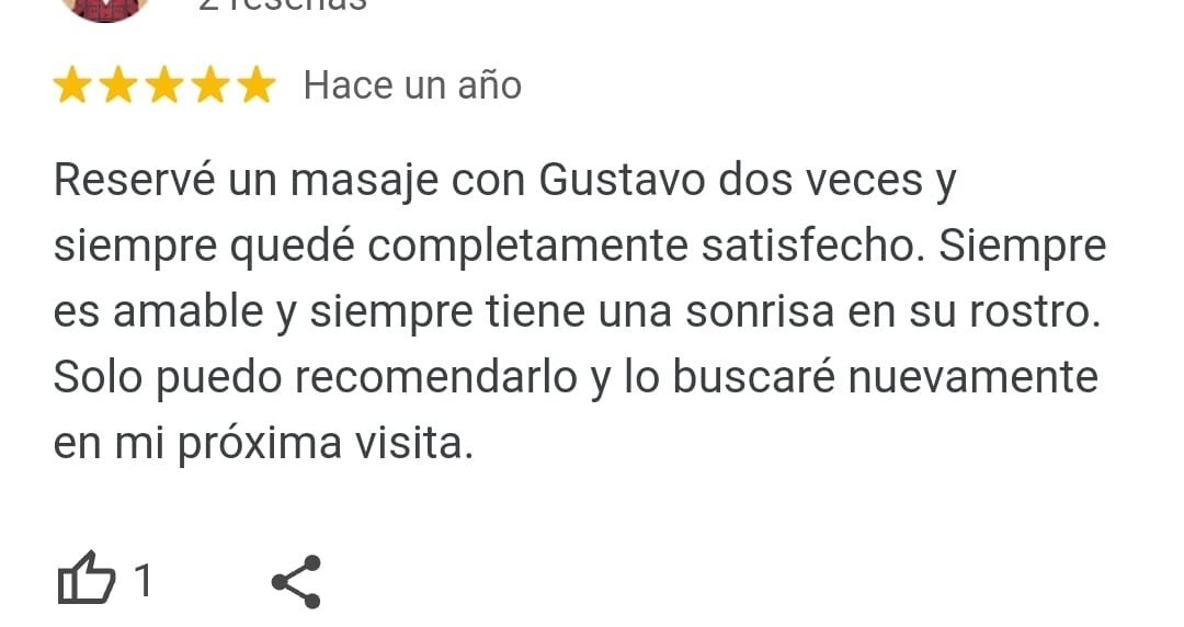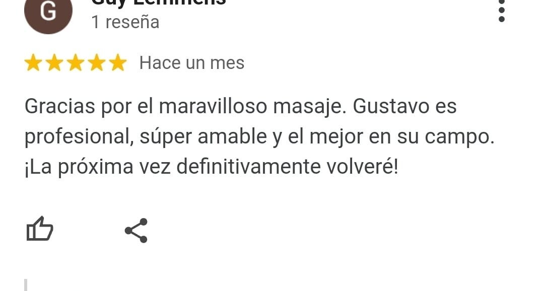 Ein wunderbarer, einfühlsamer Masseur und Mensch. Er findet die Problemstellen sofort und behandelt sie mit seinem ganzen Können. Danke Gustavo